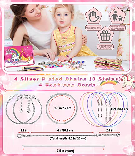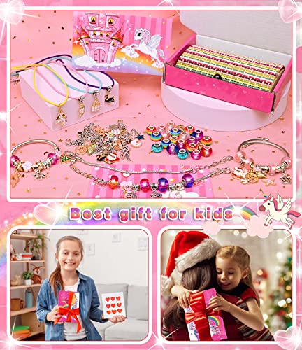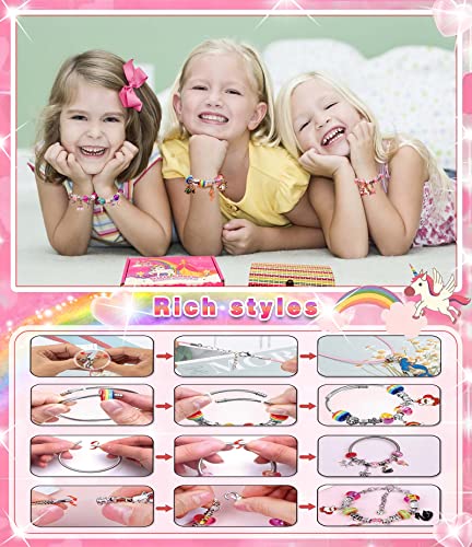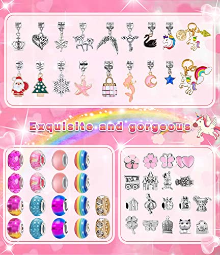 Charm Armband Kit DIY für Mädchen Kinder: 4 Halskette Schnüre, 10 farbige Perle, 4 farbige Glasperlen, 4 Regenbogenperlen, 18 Große Loch Perlen aus Metall, 18 Metallanhänger, 2 Armbänder, 1 Edelstahlarmband, 1 Federarmband, 1 Bedienungsanleitung, 1 Bunte Bambusbox. Die bunten Accessoires lassen Mädchen zusammenpassen. Kann sie vier verschiedene Arten von Armbändern und vier Halsketten, Schmuckherstellungssatz zusammenpassen lassen, einhorn geschenke für mädchen. Exquisite Weihnachtsgeschenke.