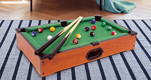 Kleiner Billardtisch aus hochwertiger und robuster Holzverarbeitung inkl. zwei hölzerner Queues, Kugeln, Triangel und Kreide
